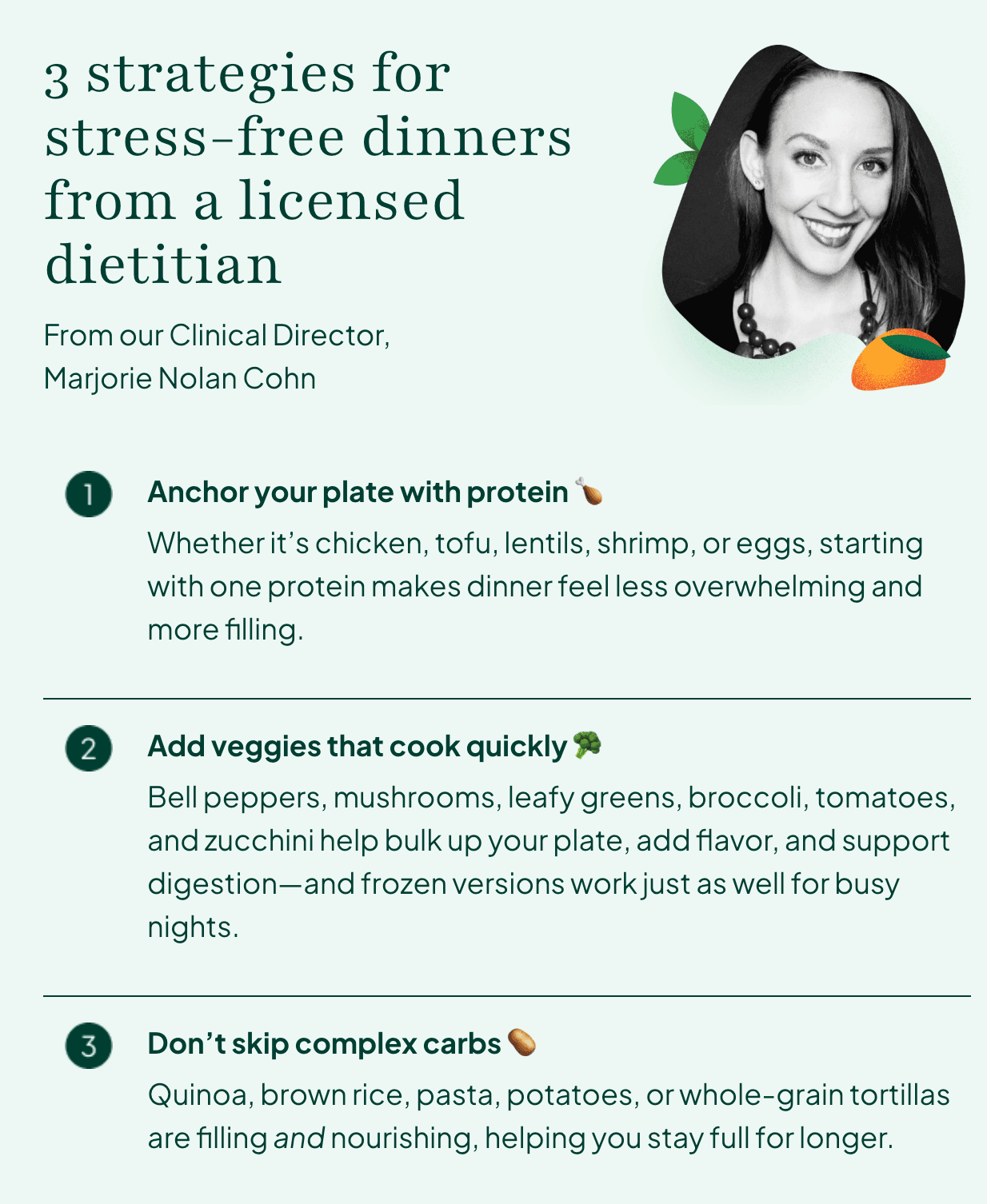 At Berry Street, we see how dinner stress impacts more than just your evening; it affects your cortisol levels, your sleep, and your relationship with food. Our Clinical Director, Marjorie Nolan Cohn, advocates for a simplified approach: anchoring your plate with protein, adding fast veggies, and never skipping those vital complex carbs. These small building blocks help you create meals that are both satisfying and easy to put together.