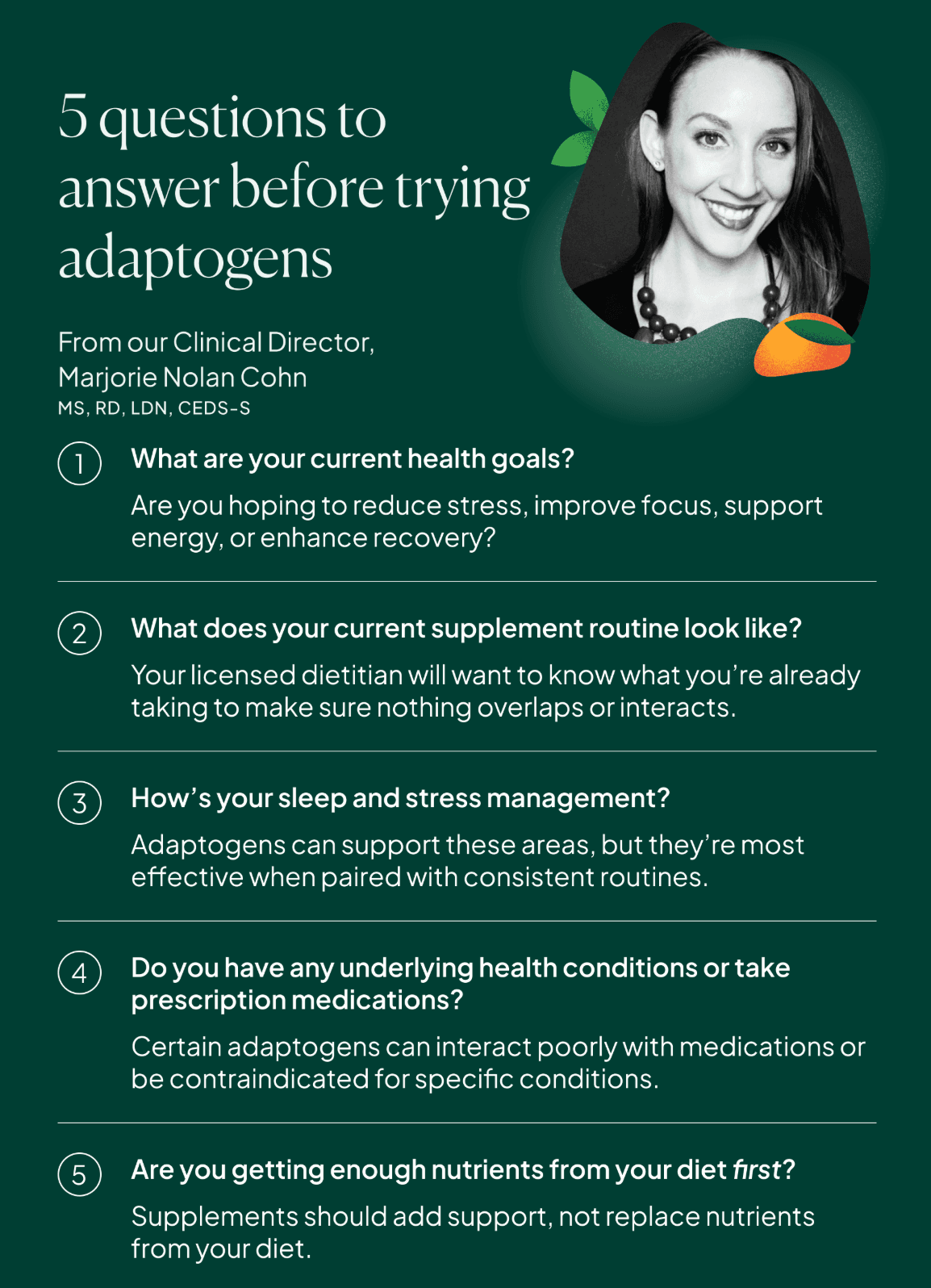 If you’re curious about trying adaptogens, dietitians recommend doing so as a complement (not a replacement!) for balanced nutrition. Here’s how to do it safely:
